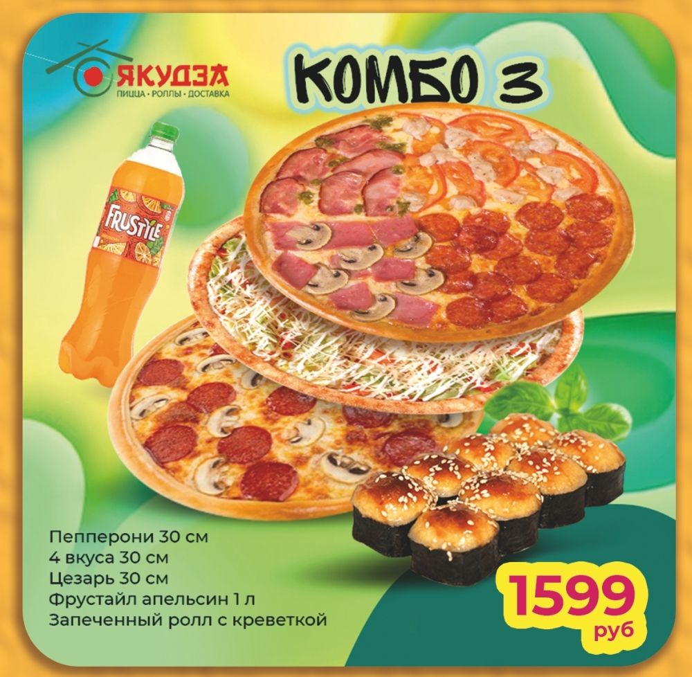 Запеченный ролл с креветкой Пицца "4 вкуса " 30 см" Пицца "Пепперони 30 см Пицца "Цезарь 30 см Фрустайл 1 литр